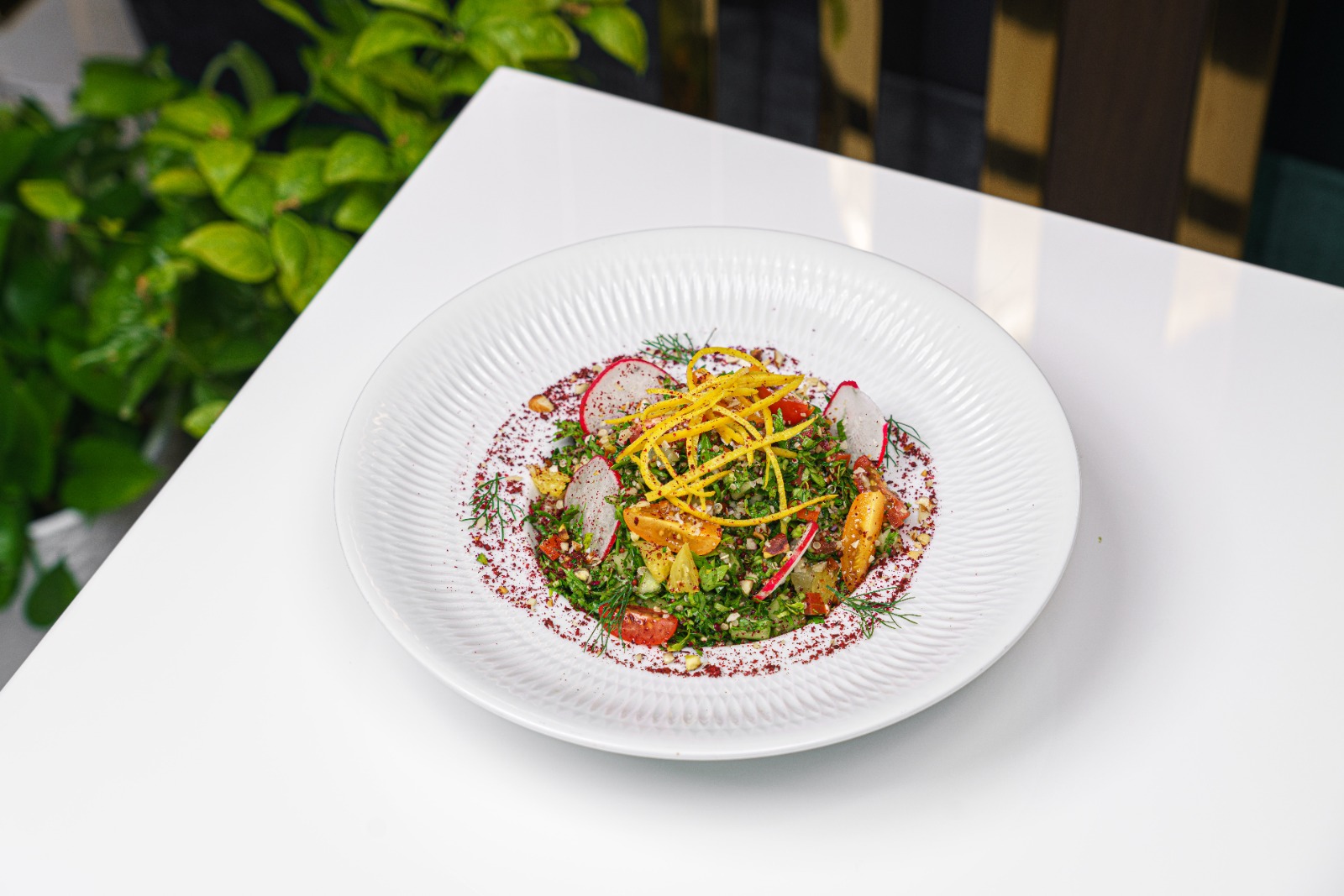 Salad Fresh parsley, tomatoes, bulgur, and mint tossed in a light lemon-olive oil dressing.